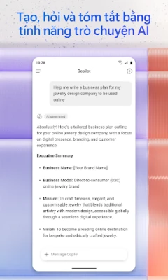 Dù bạn đang ở văn phòng hay trên đường, Microsoft 365 Copilot mang đến khả năng quét tài liệu, ảnh và ghi chú một cách tiện lợi ngay trên điện thoại của bạn. Quản lý dự án chưa bao giờ dễ dàng đến thế: tổng hợp mọi ý tưởng, tài liệu và liên kết, sau đó để Copilot tinh gọn và xâu chuỗi chúng thành Ghi chú Copilot mạch lạc. Tải lên và lưu trữ các tệp Word, Excel, PDF từ thiết bị của bạn một cách liền mạch, và nhận phản hồi tức thì từ Copilot, đồng thời lưu trực tiếp các tệp được tạo bởi trợ lý ảo này về điện thoại của bạn. Microsoft 365 Copilot thực sự là một trung tâm năng suất toàn diện, cho phép bạn tìm, chỉnh sửa tệp, quét tài liệu và tạo nội dung mọi lúc, mọi nơi với quyền truy cập tích hợp vào Word, Excel, PowerPoint và PDF, tất cả trong một trải nghiệm duy nhất. Bắt đầu sử dụng ngay hôm nay bằng cách đăng nhập đơn giản với tài khoản Microsoft cá nhân, trường học hoặc cơ quan của bạn.